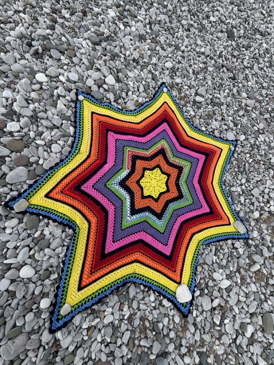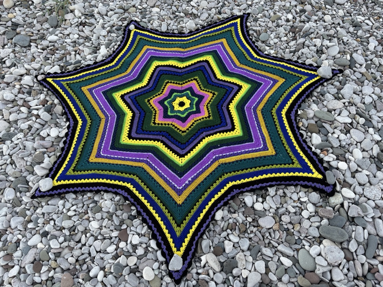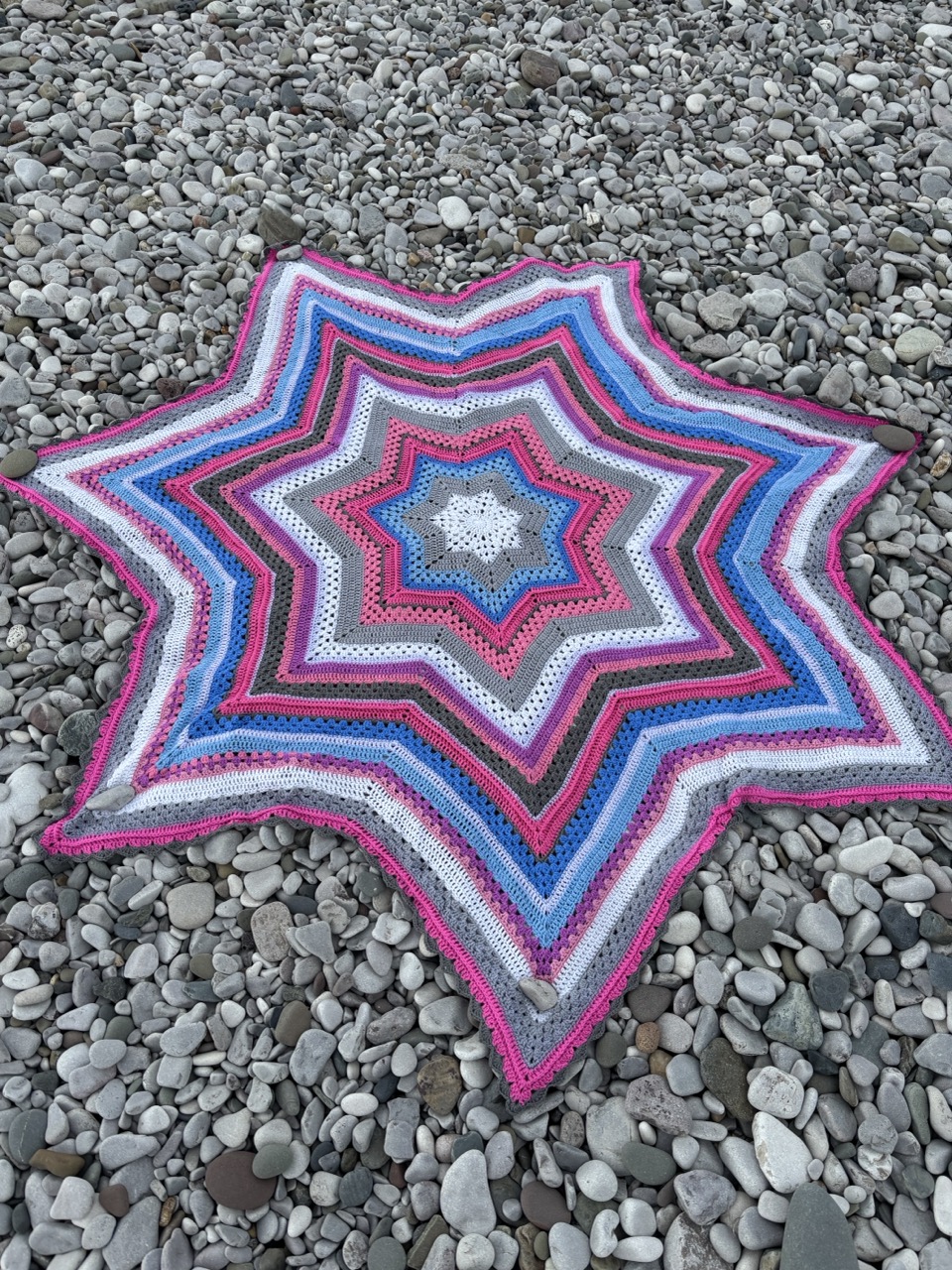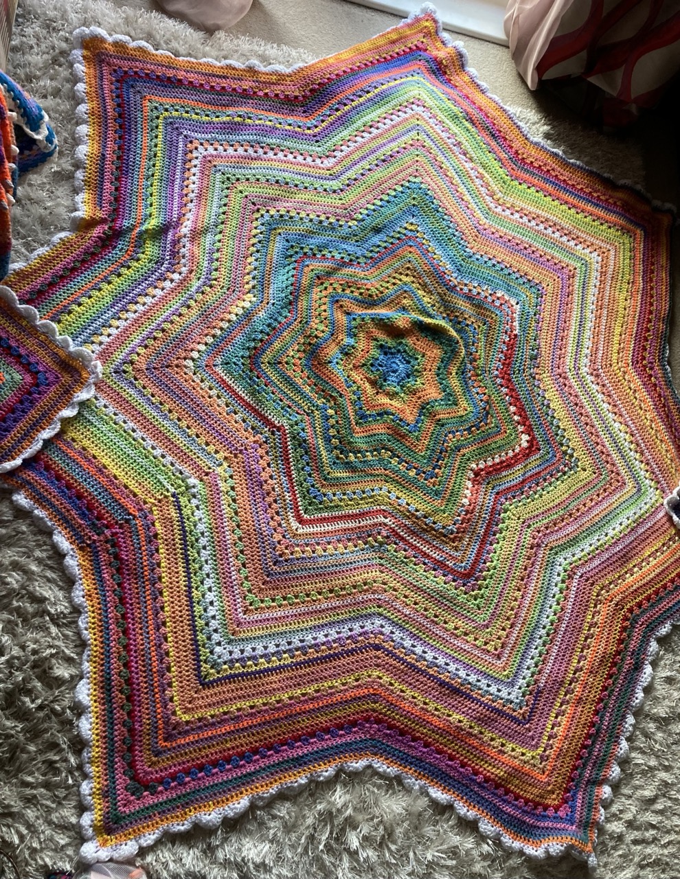 I discovered on the pattern maker’s website she does a 14-point star version – in fact two; and that there is also a version of the pattern with ridges – so more of a 3D effect going on…. The Supernova and Superstar versions of this start blanket are indeed gorgeous, and I am very excited to attempt making these also, soon enough.