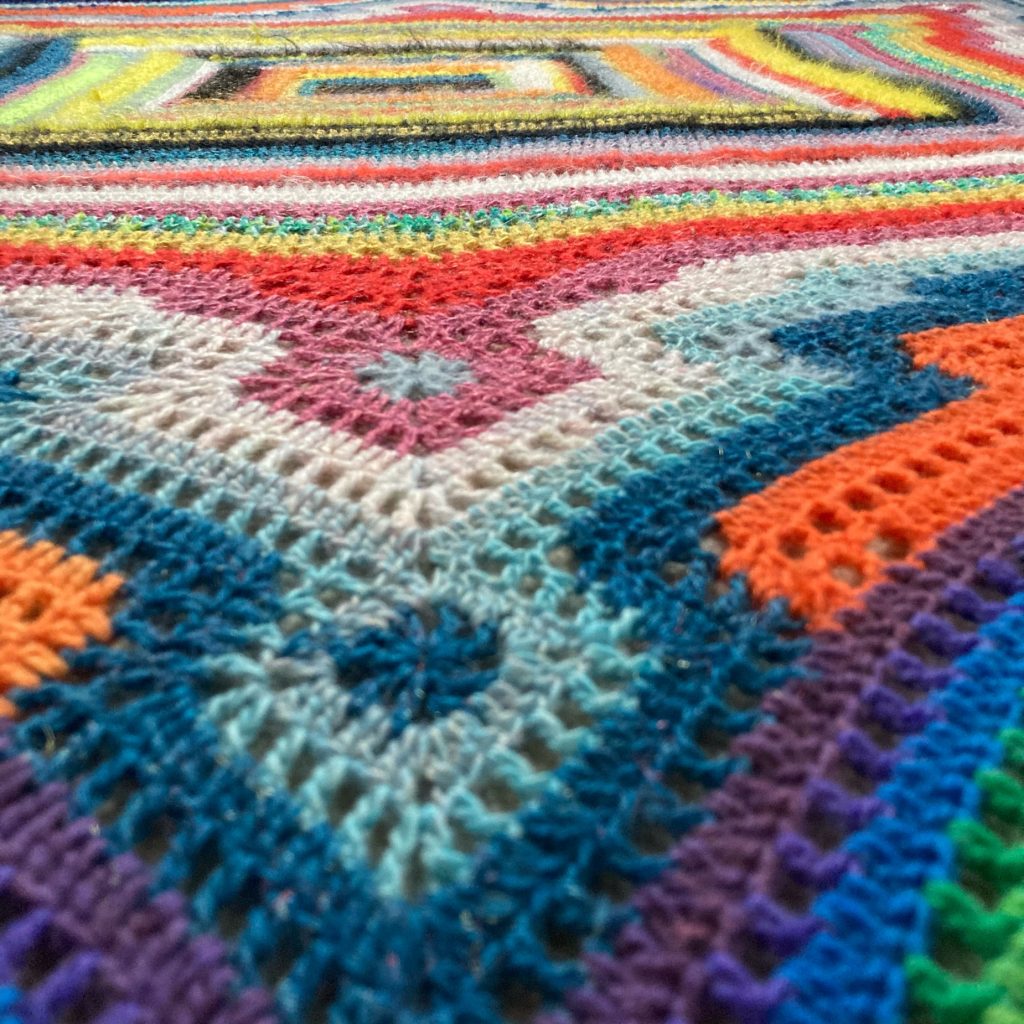 Looking back, this blanket marks a turning point. Not a dramatic one, a gentle widening. Choosing mohair and discovering its favourable qualities led me toward wearables. The tentacled construction drew me directly toward the rainbow blankets that followed, more explicitly inspired by and reflecting his glasswork. Maybe the fact that I called the construction parts tentacles, just maybe that had led me, alongside other little nudges, to make octopi for children. We will never know, and that’s OKAY. One thing we do know: